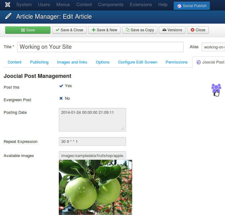 ✔ Social Publish Toolbar and Editor Button to define social post properties right in the integrated content source.
