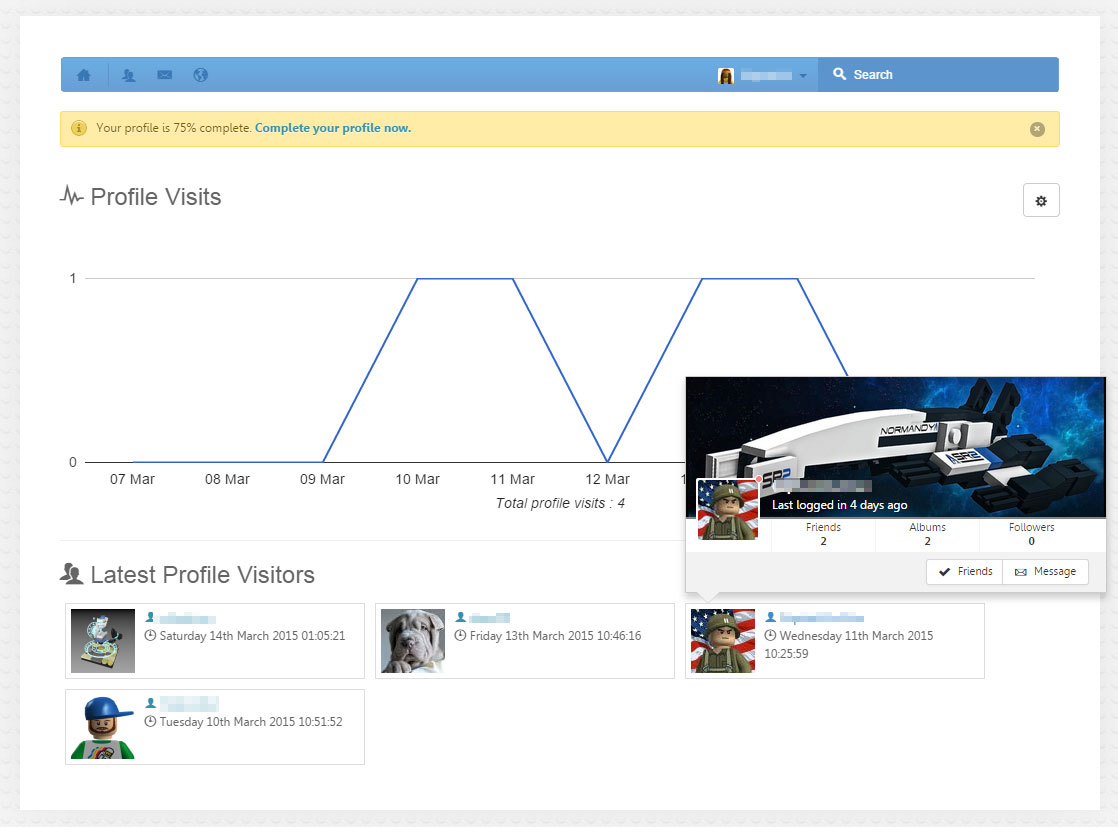 This EasySocial application shows a visits counter on dashboard to show how many users visited your profile for the last X days (X to be set by admin or by user). It also has a Canvas view with daily visits chart and visitors list. (It is like the similar Linkedin feature)