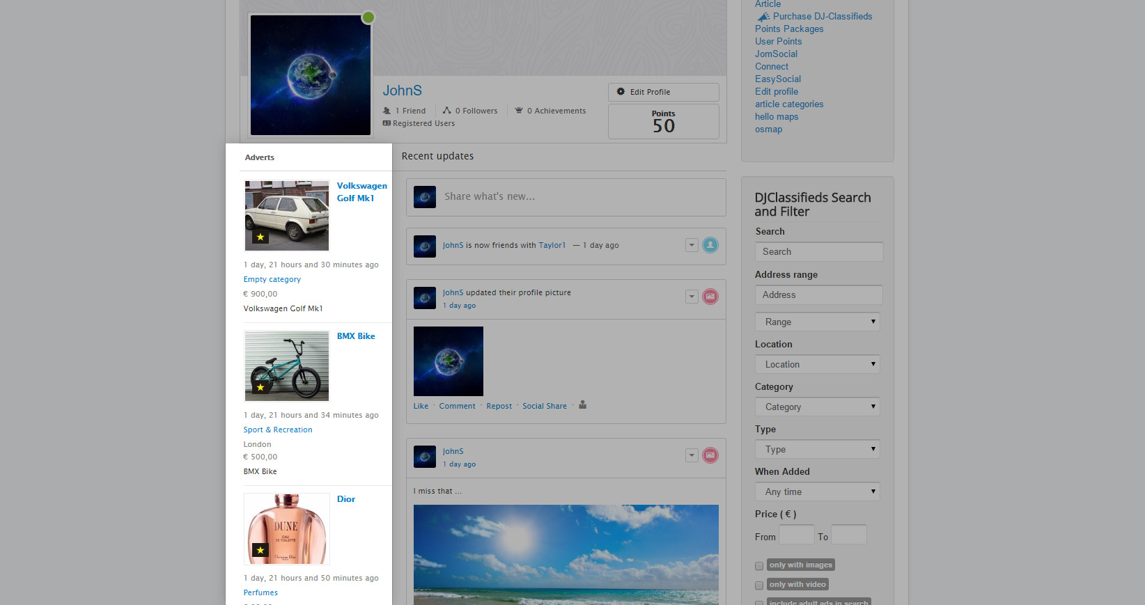 Widget from this application’s allows to displays DJ-Classifieds Joomla component adverts on user’s profile