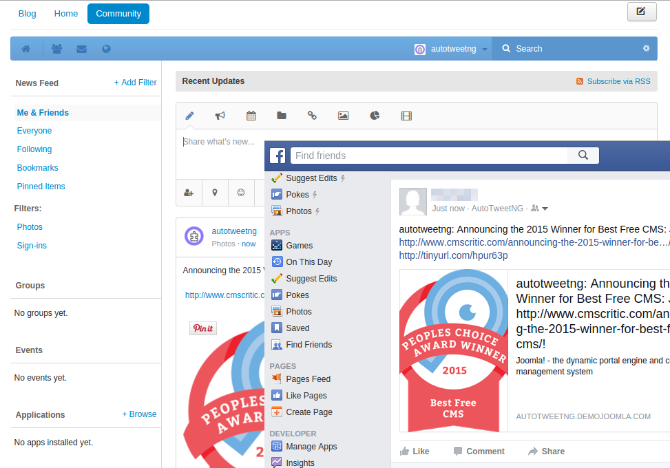AutoTweet NG Free is a Joomla! extension to automate post publishing to Facebook, Twitter, LinkedIn and more. **AutoTweet-EasySocial** plugin integrates EasySocial, the best social networking extension for Joomla!, with Joomla! and AutoTweet.