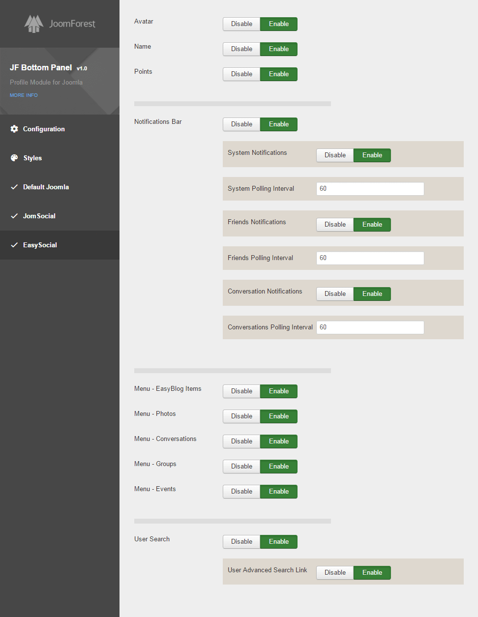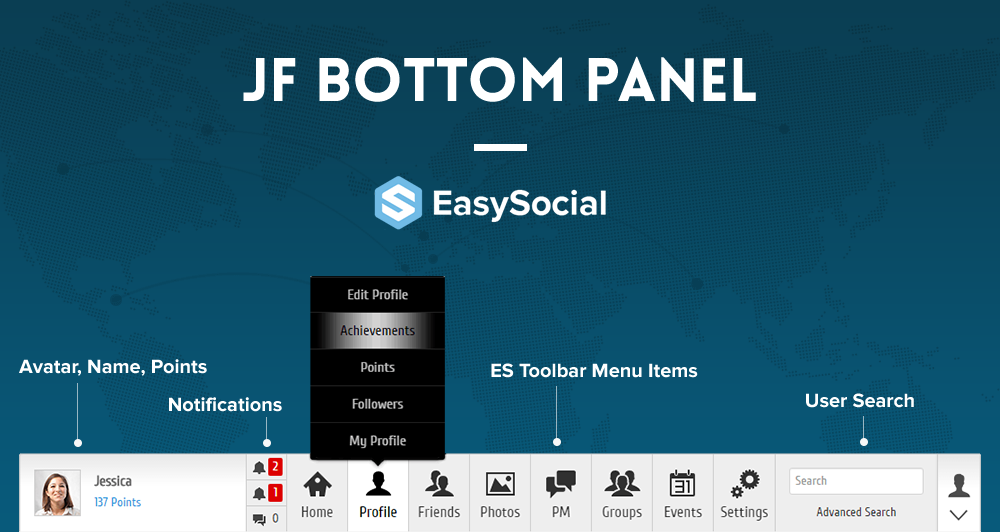 "JF Bottom Panel" is beautiful profile panel module for EasySocial. It shows avatar, points, EasySocial menu items, user search, notifications.