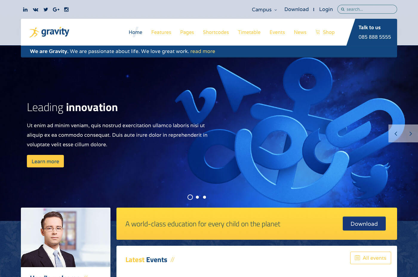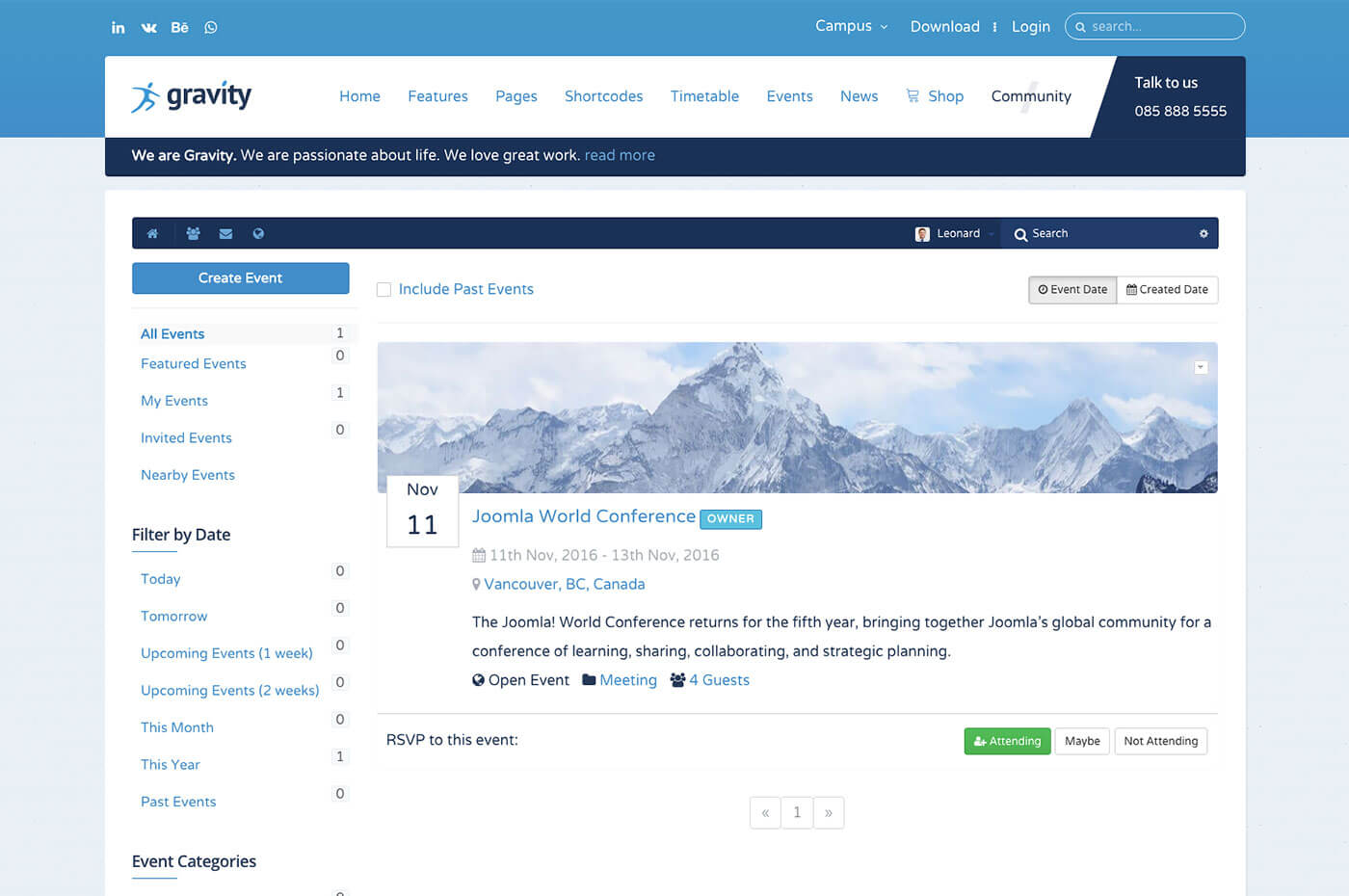 Gravity is an education, academic courses, school, university or college Joomla template designed for educational institutions. It comes with 8 beautiful color styles, timetable scheduler, events components, custom widgets and quickstart sample data to get you up and running fast.