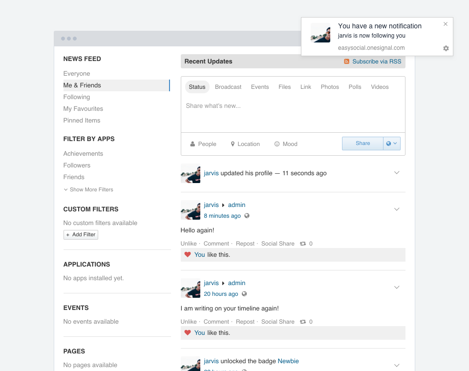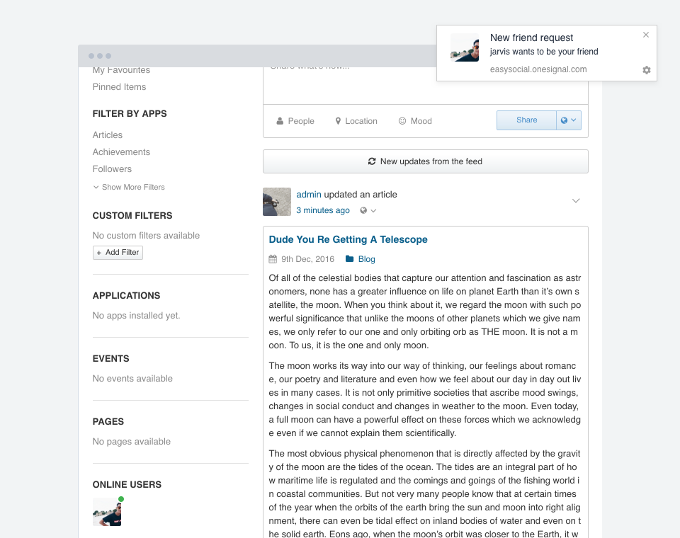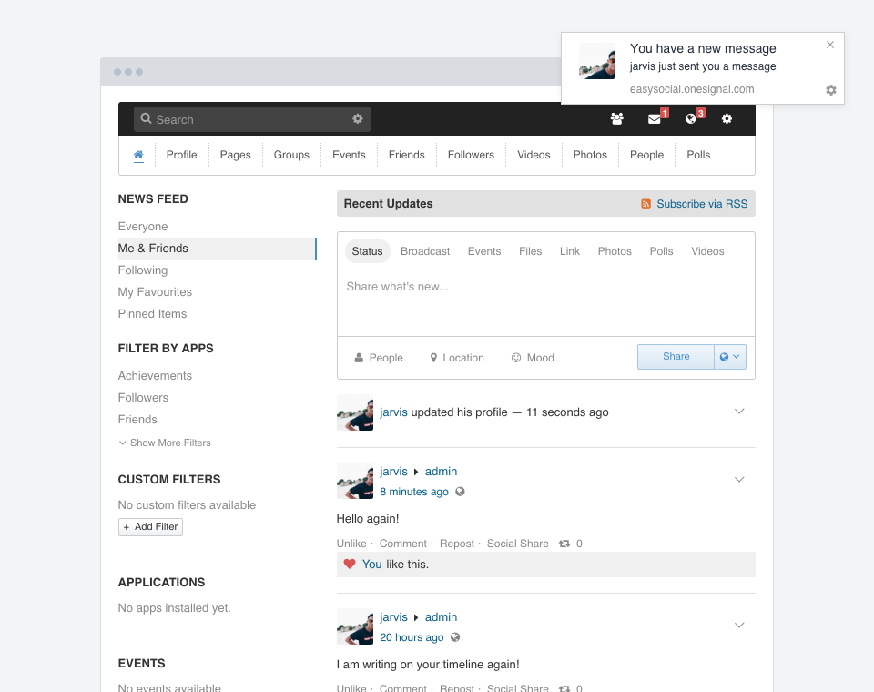 This application integrates with OneSignal web push notifications. It allows users to subscribe to notifications and also allow them to get notified whenever a new notification, friend request or conversation is created.