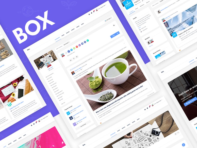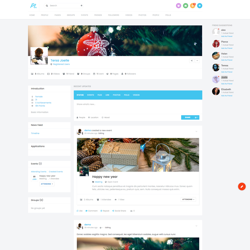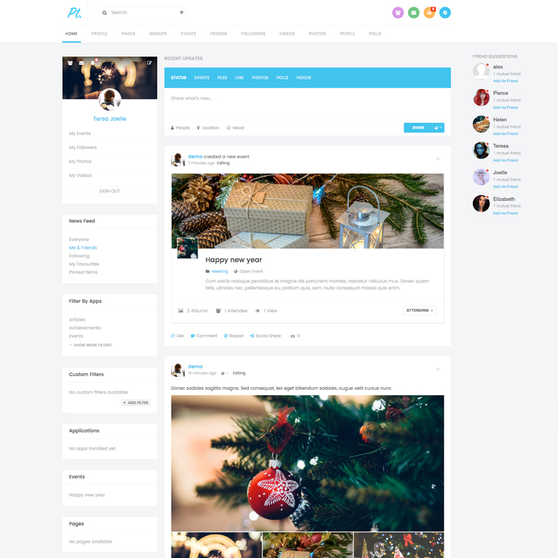 - Flexible menu system with Fullwidth & Boxed Horizontal Menu navigation showing built-in notifications plus new conversations and friend requests
