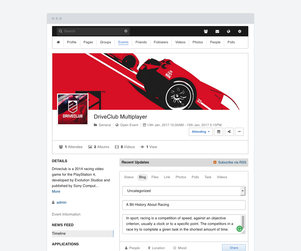 These posts would appear on the activity stream and also under a blog section within the event page itself.