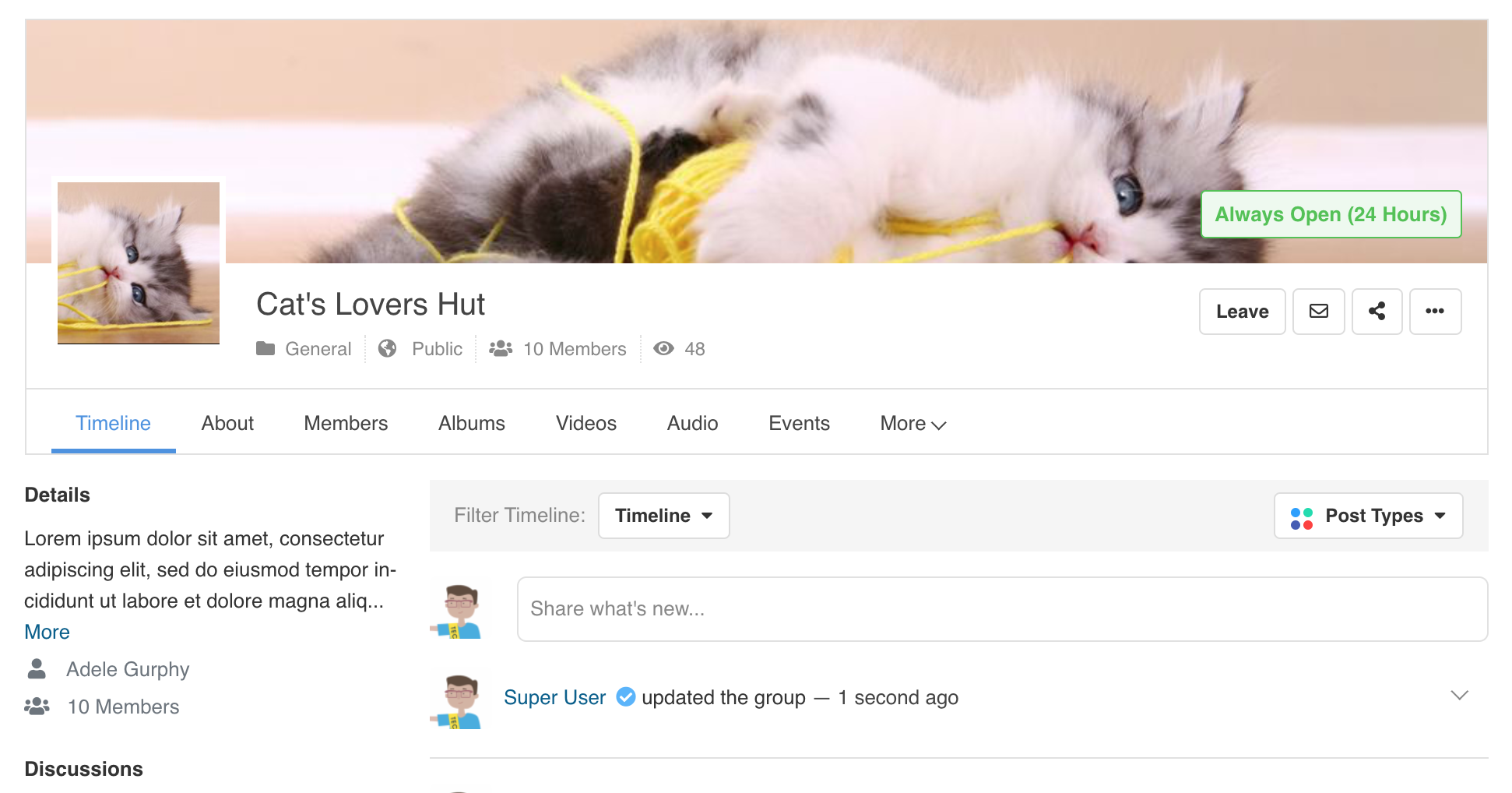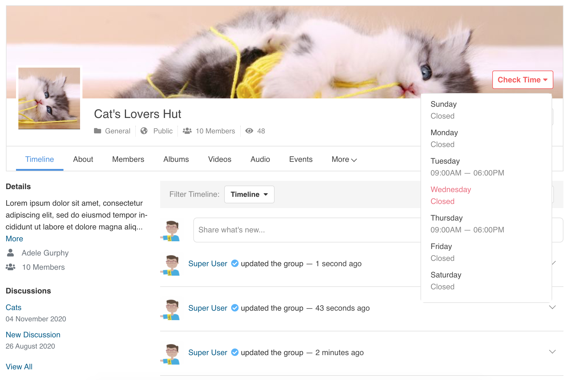 This custom field allows your groups to display business operation hours right on the group headers. This tool is geared towards local enterprises hosted on your social sites which can be used to manage and retain customers or getting new leads from the community.