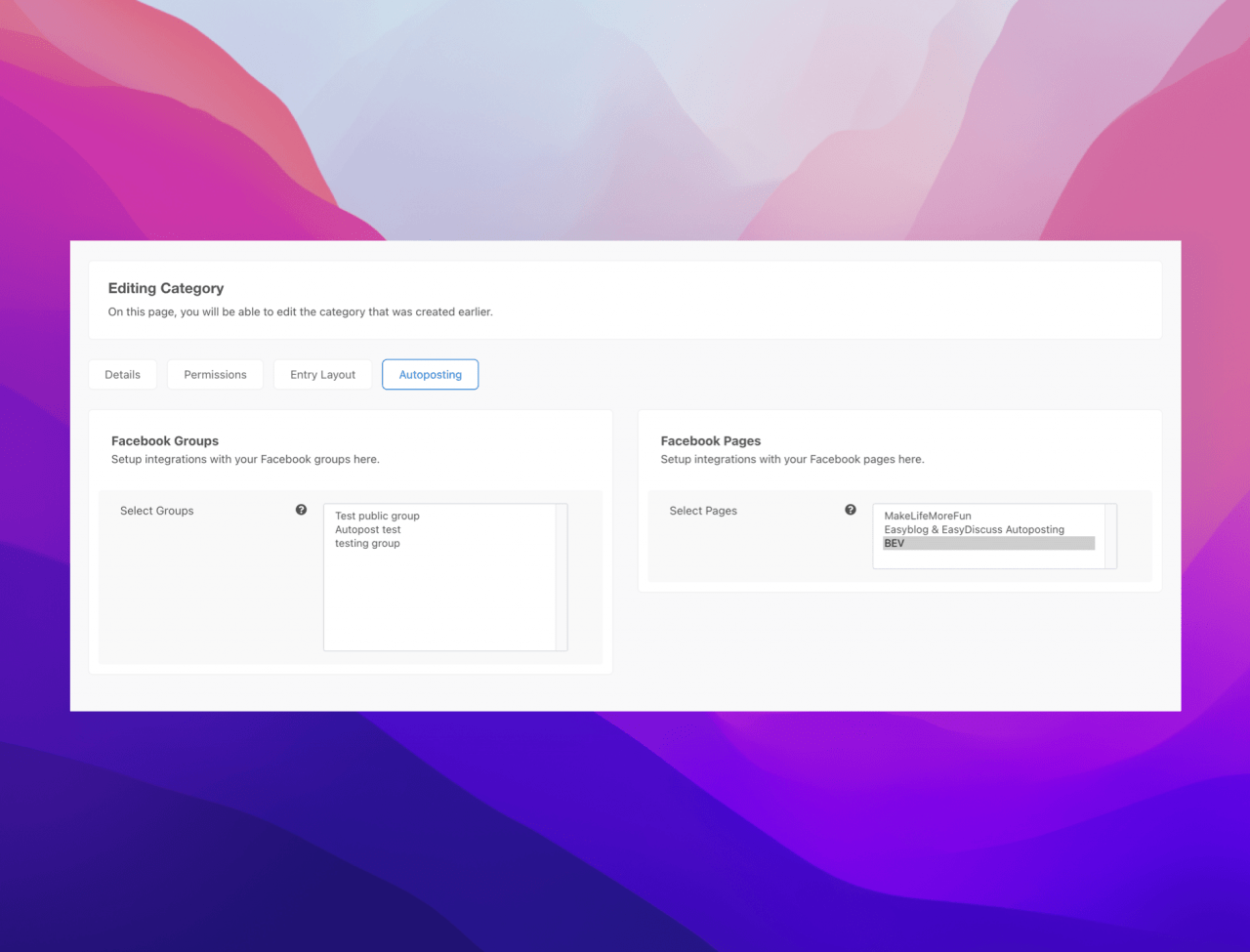 In EasyBlog 6, you can also setup different auto-posting options to different groups and pages for Facebook dependent on which category the post is filed under.