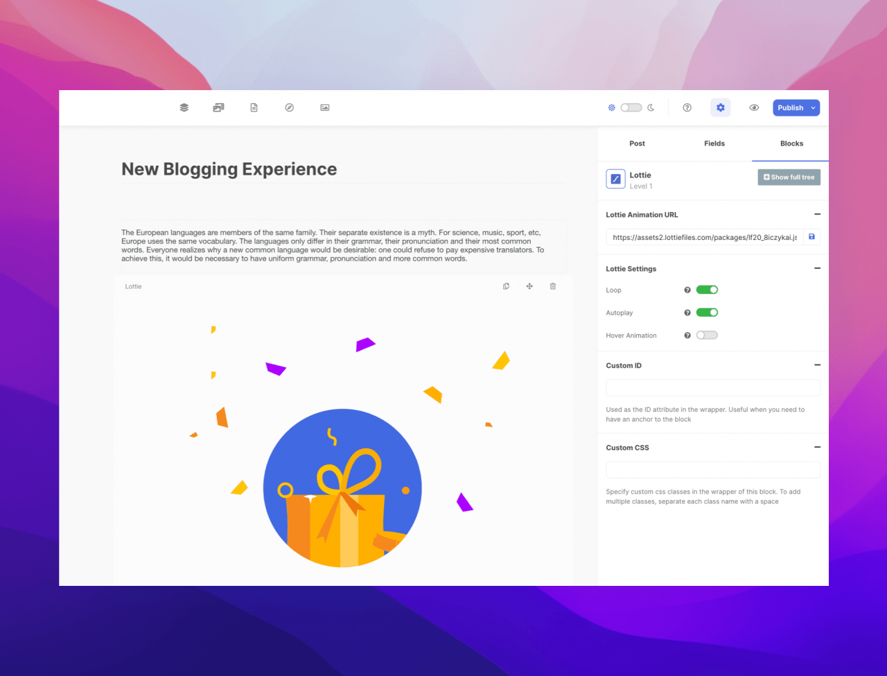 Lottie block allows you to render animations in your blog post. It is much smaller than GIFs and the best of all, there are free-to-use animation files that you can embed on your post.