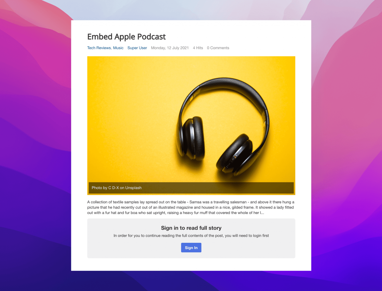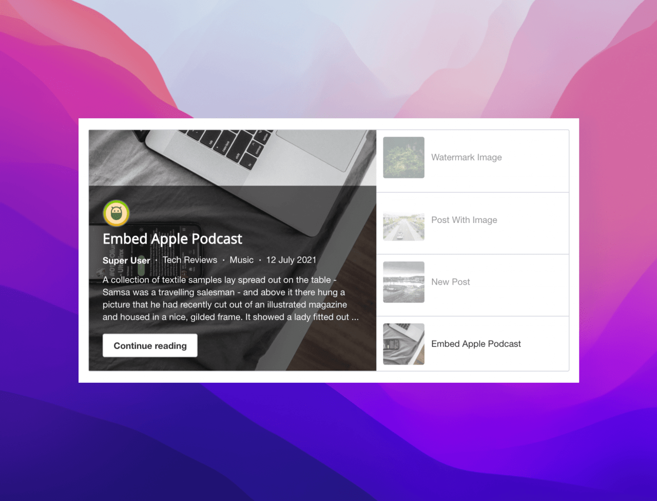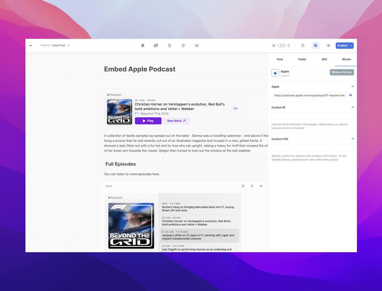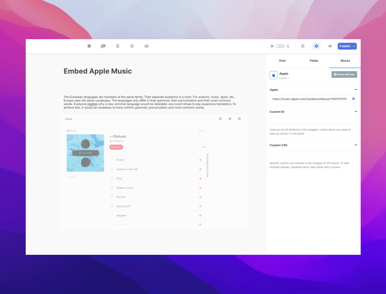 The new Apple block allows you to embed and share the following items from Apple: