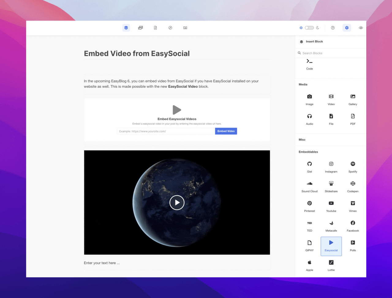 For sites with EasySocial installed, authors can now embed their videos from EasySocial.