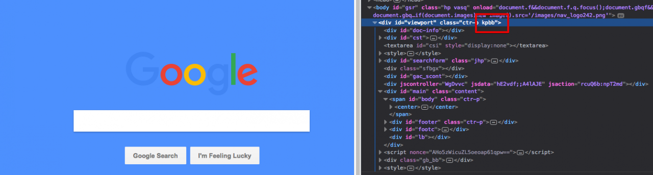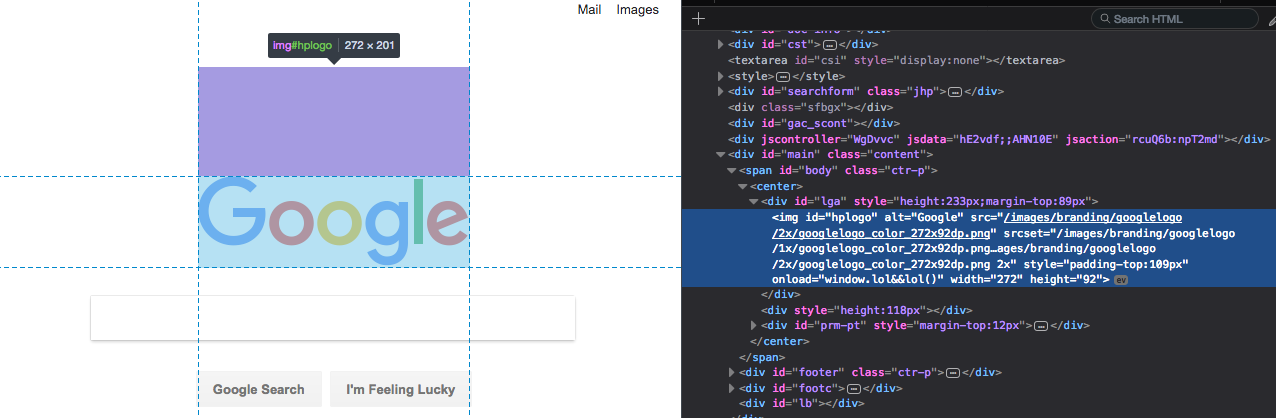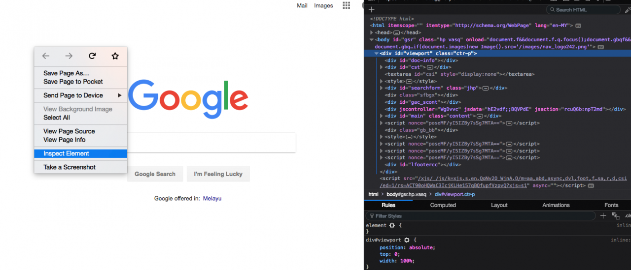 Open up a new tab, and type https://www.google.com. Right-click on Google logo and select Inspect Element. If you're using Google Chrome, you'll see the Elements tab opens and the inspected element will be highlighted. If you're using Firefox, then you'll see the Inspector tab opens and the inspected element will be highlighted.
