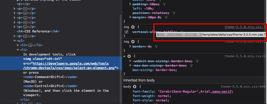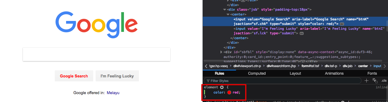 Using the Styles or Rules tab when you want to change or add new CSS declaration to an element. Do note that the list of CSS rules displayed here are applied to whatever element that is currently selected. The selected element is highlighted blue in the DOM Tree. To the right, the element's styles are shown in the Styles tab on Google Chrome or Rules tab on Firefox.