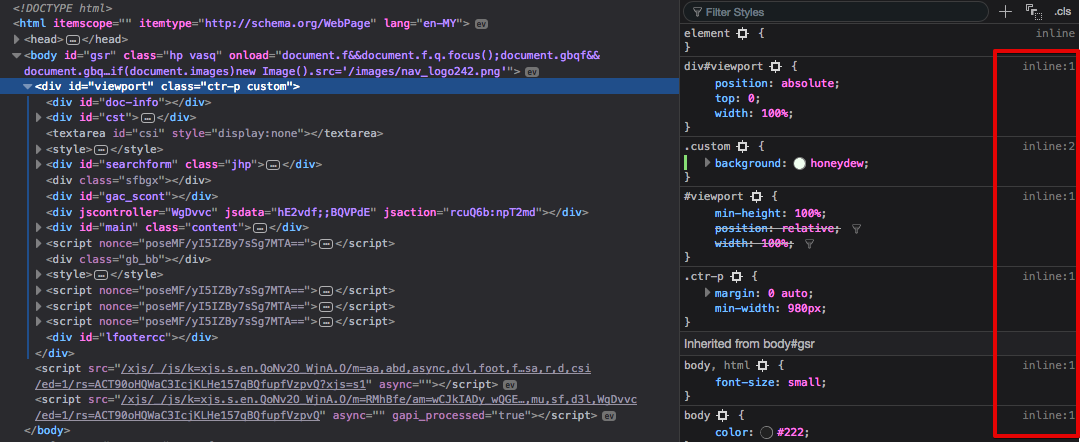The Elements on Google Chrome or Inspector on Firefox panel allows you to select, view or change the styling of one element. In the styles panel, click on the link next to a CSS rule to open the external stylesheet that defines the rules. The link actually shows where does this styling is coming from, and on which line. However, in Google page, all styling are defined inline.