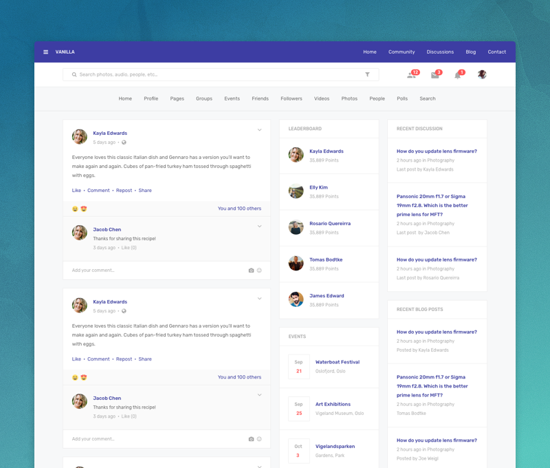 Our designers have carefully crafted and calculated pixel by pixel to ensure that the columns and white spaces used were just right, not too wide and not too narrow, hence giving Vanilla a contemporary vibe. Apart from it being a social template, it seems to be a perfect fit for intranet sites as well.